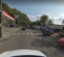 Image prise depuis la nationale 2, à gauche on devine la station service Esso, à droite des camions garés, dans le fond un morne en pente descendante vers la mer (situé à droite mais non visible)